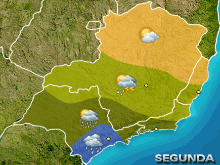 Muitas nuvens e chuva a qualquer hora do dia no leste de MS e sul de GO. No sul e oeste de Mato Grosso e de Mato Grosso do Sul o sol aparece entre nuvens, faz frio e não chove. No Distrito Federal, nordeste e leste de Mato Grosso o sol brilha forte