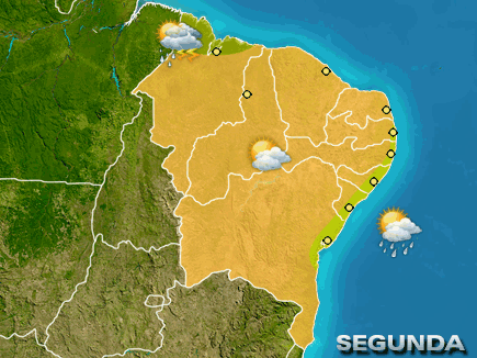 Ar seco impede a formação das nuvens de chuva em quase todas as áreas do Nordeste. Chove de forma passageira somente no litoral entre Salvador e João Pessoa e em Fortaleza. Em São Luís, as pancadas isoladas de chuva ocorrem a partir da tarde.