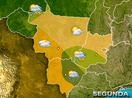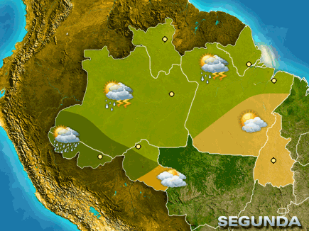 O sol brilha forte e faz calor à tarde no sul e leste do PA e no TO. Ocorrem pancadas de chuva desde cedo no norte do AP e de RR, sul do AM e no AC. Nas demais áreas, faz sol, calor e acontecem pancadas de chuva isoladas com raios a partir da tarde.
