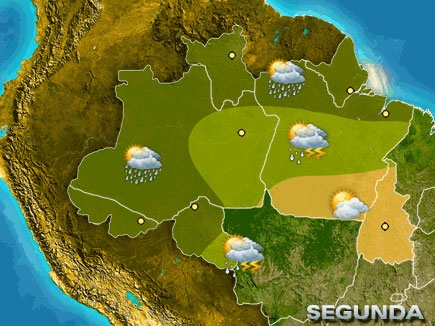 Tempo seco no sul do PA e no TO. Períodos de nublado e chuva no AC, no centro-norte e oeste do AM, em RR e no norte e noroeste do PA e no AP. Pancadas de chuva à tarde nas demais áreas do Norte.