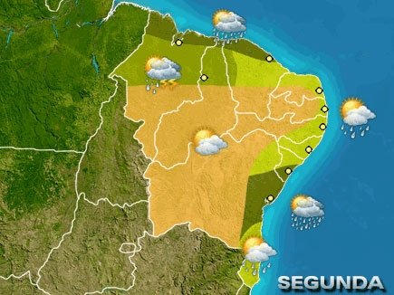 Sol entre nuvens e chuva no litoral entre o MA e o CE e em Salvador, BA. Sol o dia todo, sem chuva, no interior da BA, de PE e da PB, sul do CE e do MA e no centro-sul do PI. Sol e pancadas de chuva nas demais áreas nordestinas.
