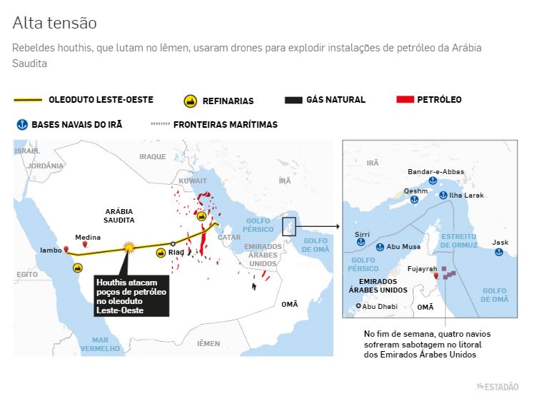 No dia 12 de maio, quatro petroleiros – dois sauditas, um dos Emirados Árabes Unidos e um norueguês – foram atingidos por ataques ainda não explicados no Golfo do Omã. O governo americano afirmou que o ataque foi provocado “quase com toda certeza” por minas navais iranianas.