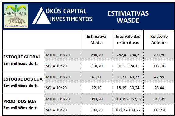 Estimativas dos analistas para o relatório de oferta e demanda a ser divulgado amanhã pelo departamento de agricultura dos EUA.
