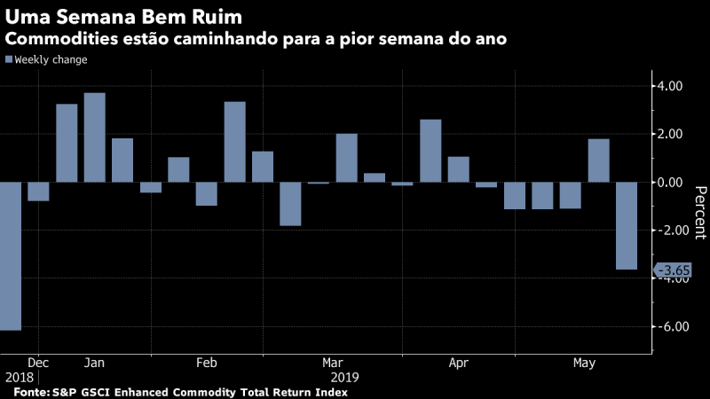 A confiança do investidor no crescimento econômico global foi abalada pela prolongada guerra comercial entre Estados Unidos e China, afetando o desempenho de várias commodities, do cobre ao petróleo. O índice S&P GSCI Enhanced Commodity Total Return caiu cerca de 4% esta semana e está a caminho da maior queda desde dezembro, sob o impacto dos planos do governo de bloquear os contratos do setor de tecnologia dos EUA com cinco empresas chinesas. Assim, o Goldman avalia, de forma cautelosa, que o recente declínio nos preços pode ser uma oportunidade de compra.
