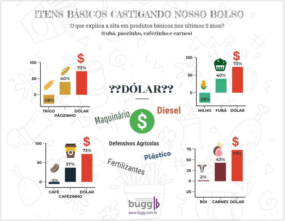 Seria exagerado e até leviano atribuir ou atrelar a alta desses produtos básicos única e exclusivamente ao dólar. Existem diversos outros componentes. Mas pense aqui comigo: o fubá é produzido a partir do milho, o qual, em seu processo de cultivo e produção são utilizados fertilizantes e defensivos agrícolas que são, em grande parte, importados dado que não somos autossuficientes em potássio e temos uma indústria química não tão desenvolvida assim. Sua colheita é feita através de máquinas sofisticadas e que fazem do Brasil a potência agrícola, as quais são importadas de grandes empresas como a John Deree por exemplo. Da lavoura ele vai para fábrica transportado normalmente por caminhões movidos a diesel (acredito que está bem fresco na memória de todos os impactos do dólar nos preços dos combustíveis). Chegando a fábrica ele passará por uma série de processos, os quais envolvem a utilização de outras máquinas, as quais me arrisco a dizer que são importadas, afinal não somos conhecidos por uma indústria de bens de capital pujante não é mesmo? Uma vez processado, esse fubá será colocado em uma embalagem de plástico, que nada mais é do que um polímero sintético derivado do petróleo, notadamente cotado em dólar. Uma vez pronto, o fubá é transportado advinha como? Novamente o componente Diesel reaparece na equação.