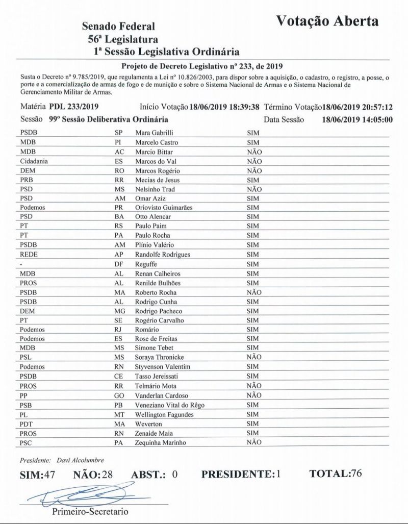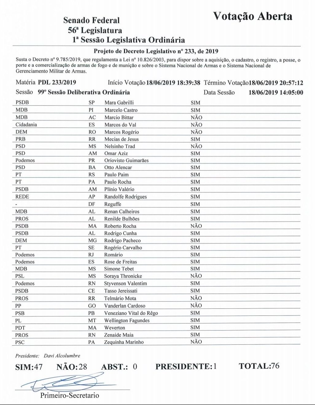 Por 47 votos a favor e 28 contrários, os senadores decidiram aprovar projeto que susta o polêmico decreto, promessa de campanha do então candidato à Presidência da República Jair Bolsonaro.