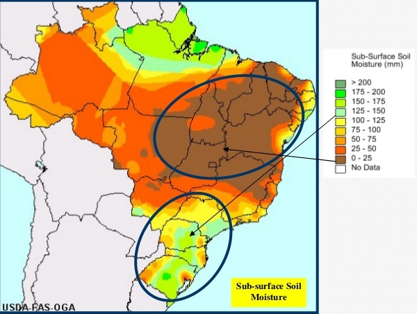 Alguns analistas climáticos estão tendo uma projeção de que podemos ter um problema de seca na safra de verão brasileira! Mapas indicam um provável fim da La Niña e um retorno do El Niño. O mapa abaixo mostra as condições de umidade do solo já abaixo do previsto no centro oeste e em toda a área escura.